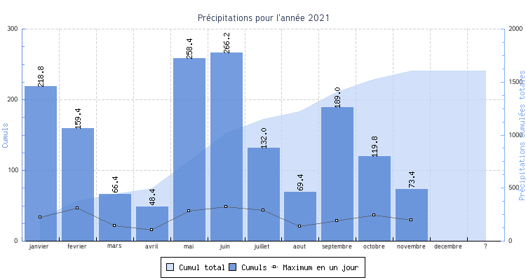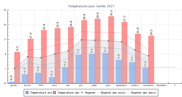 | janvier | -8.9 °C | -2.4 °C | 9.3 °C | 3.4 °C | -0.8 °C | 6.2 km/h | 53.1 km/h | 4 |