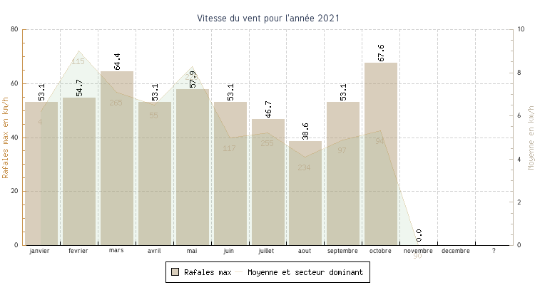 | fevrier | -4.3 °C | 3.1 °C | 17.4 °C | 10.6 °C | 6.4 °C | 9.0 km/h | 54.7 km/h | 115 |